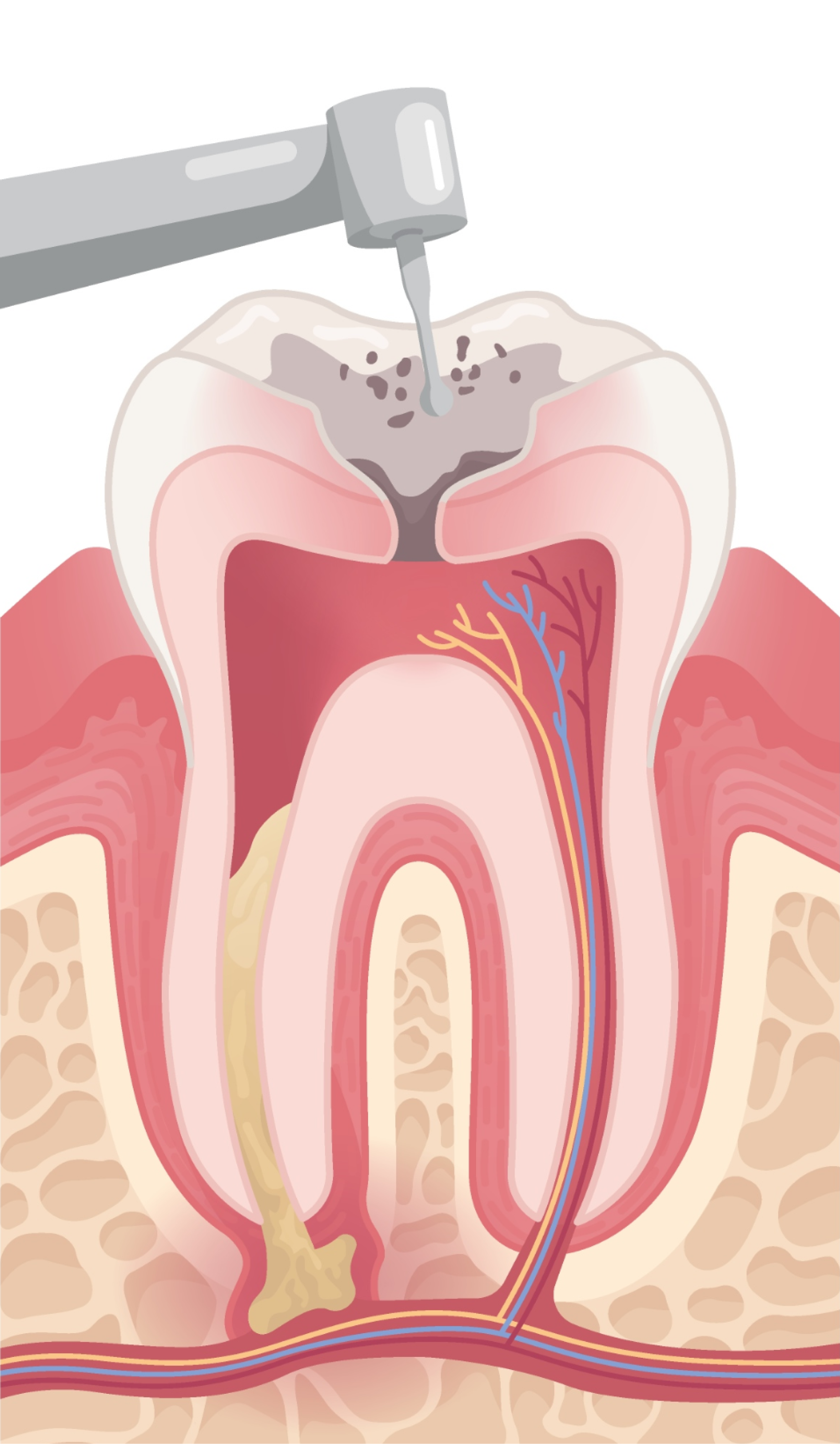 마취 후 충치·염증 부위를 제거하며 치료할 치아를 정리합니다.