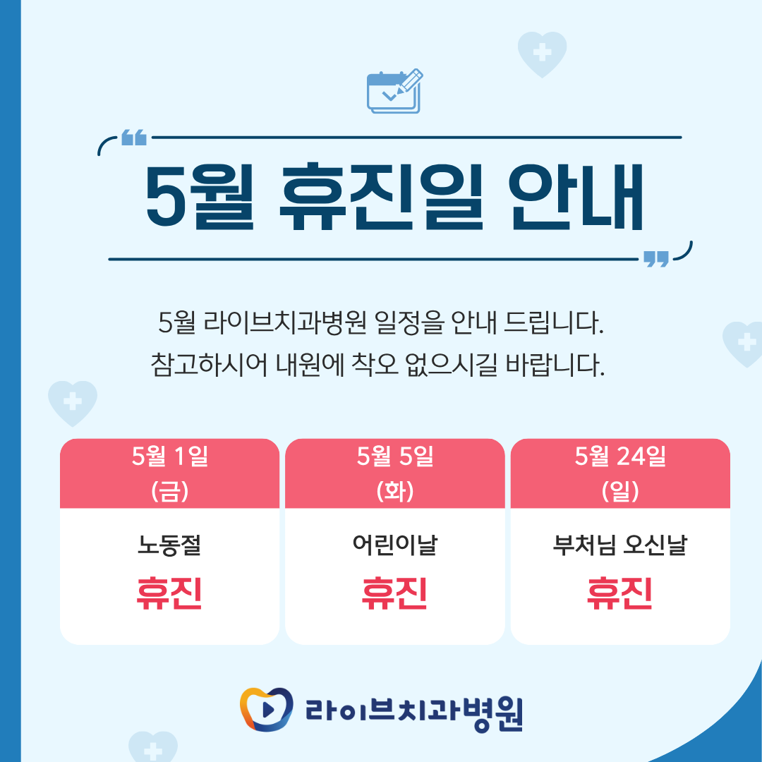 노동절(구 근로자의날 / 1일,금), 어린이날(5일,화), 부처님 오신날(24일,일) 휴진입니다.