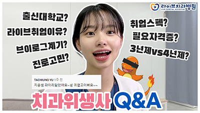 브이로그 3탄에서 예고했던 '치과위생사 큐앤에이'가 드디어 업로드되었습니다 ~!! 많은 분들께서 다양한 질문을 남겨주셔서 그중에서 지윤쌤이 직접 답변해줄 수 있는 것들을 추려서 답변 준비해봤어요~! 평소 치과위생사에 대해 궁금한 것이 있었다면 이 영상을 통해 알아보시는 건 어떨까용?? :)♥ --- 라이브TV의 재미있는 영상과 더 함께하고 싶으시다면 '좋아요'와 '구독하기&..